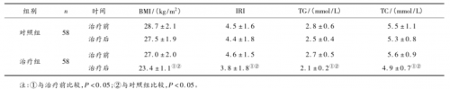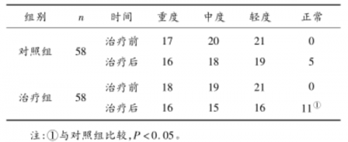 2 组患者治疗前后肝脏 B 超变化 2 组治疗后肝脏 B 超检查显示肝脂肪变程度得到了不同程度改善,其中治疗组恢复正常11例(19.0%),对照组恢复正常 5 (8.6%),治疗组恢复正常率显著高于对照组(P<0.05)。见表 3。 表3. 2 组患者治疗前后肝脏 B 超变化