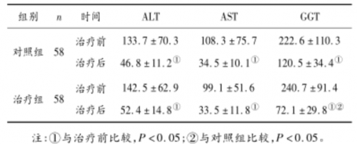 治疗后,2 组患者 ALT、AST及GGT 水平均较治疗前明显降低(P均 <0.05);治疗组治疗后 GGT水平较对照组降低更明显(P< 0.05),而 2 组治疗后 ALT 及 AST 水平比较差异无统计学意义(P均>0.05)。治疗组及对照组在治疗24周后,各有53例(91.4%)和52例(89.7%)患者获得 HBV DNA 转阴,2 组 HBV DNA 转阴率比较未见显著性差异(P>0.05)。见表 2。 表2. 2 组患者治疗前后肝功能指标水平比较