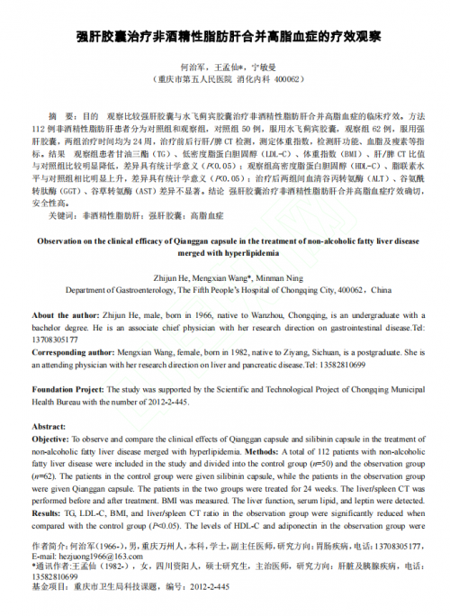 参考文献: [1]何治军,王孟仙,宁敏曼.强肝胶囊治疗非酒精性脂肪肝合并高脂血症的疗效观察[J].海南医学院学报,2016,22(14):1518-1520.DOI:10.13210/j.cnki.jhmu.20160301.026.