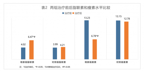 强肝胶囊显著升高患者脂联素水平、降低瘦素水平,改善瘦素抵抗 观察组脂联素和瘦素水平与治疗前相比明显改善(P<0.05);与对照组相比,观察组脂联素与瘦素水平显著改善(P<0.05)。